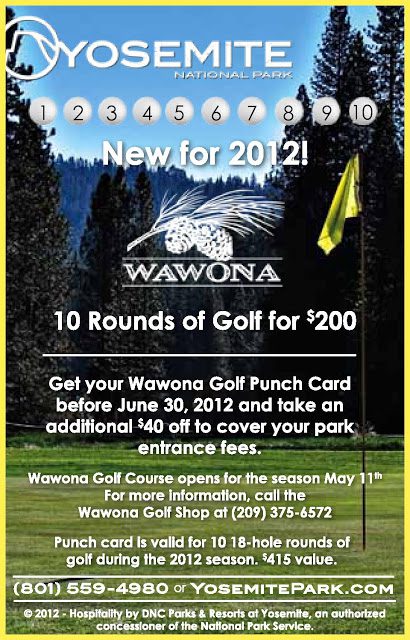 This Friday, May 11, 2012, the Wawona Golf Course opens for the season. A rate schedule is provided below. For more information about golf in Yosemite Park or to make your tee time reservations, call the Wawona Golf Shop at (209) 375-6572.
