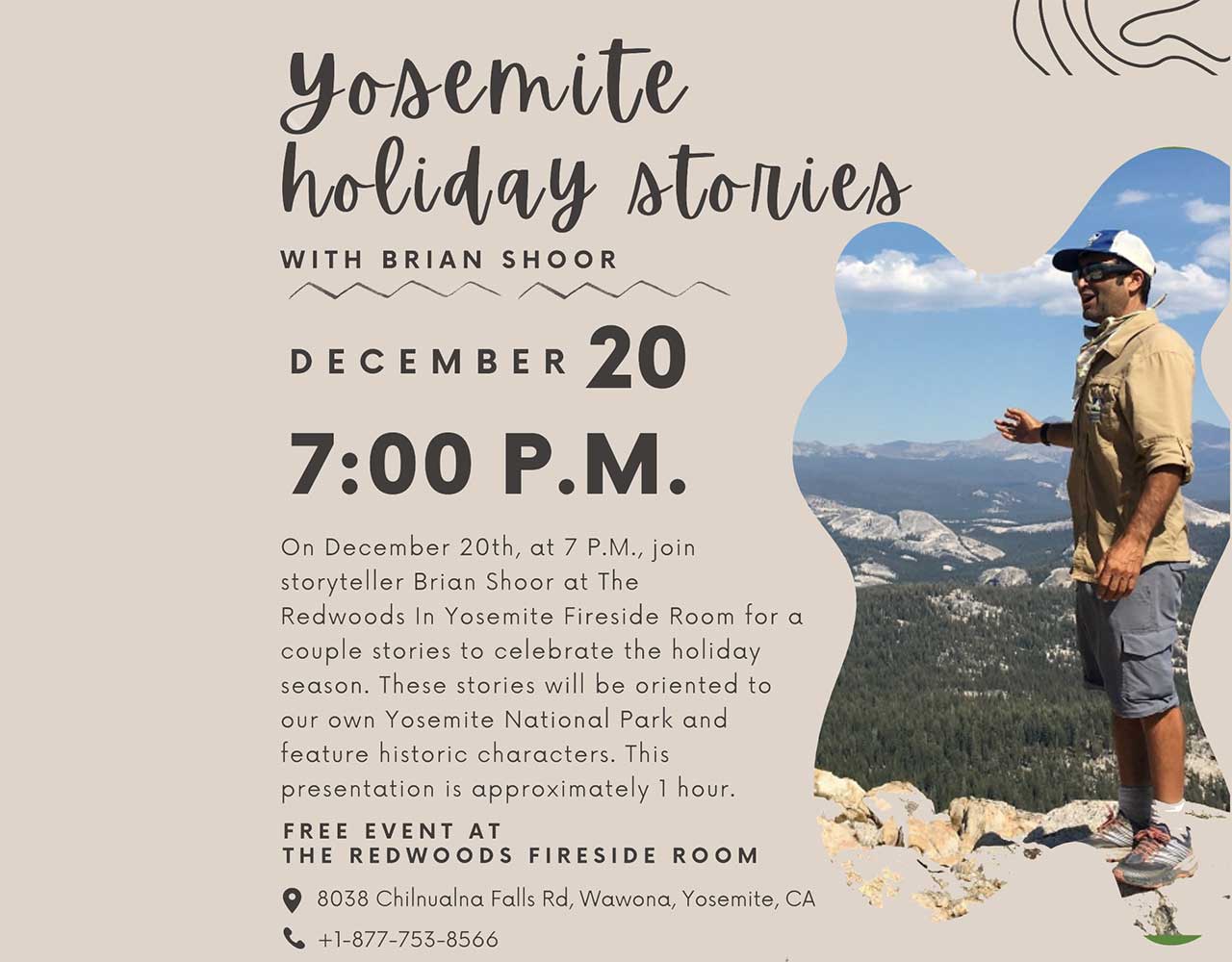 On December 20th, at 7 P.M., join storyteller Brian Shoor at The Redwoods In Yosemite Fireside Room for a couple stories to celebrate the holiday season. These stories will be oriented to our own Yosemite National Park and feature historic characters. This presentation is approximately 1 hour. View More Details