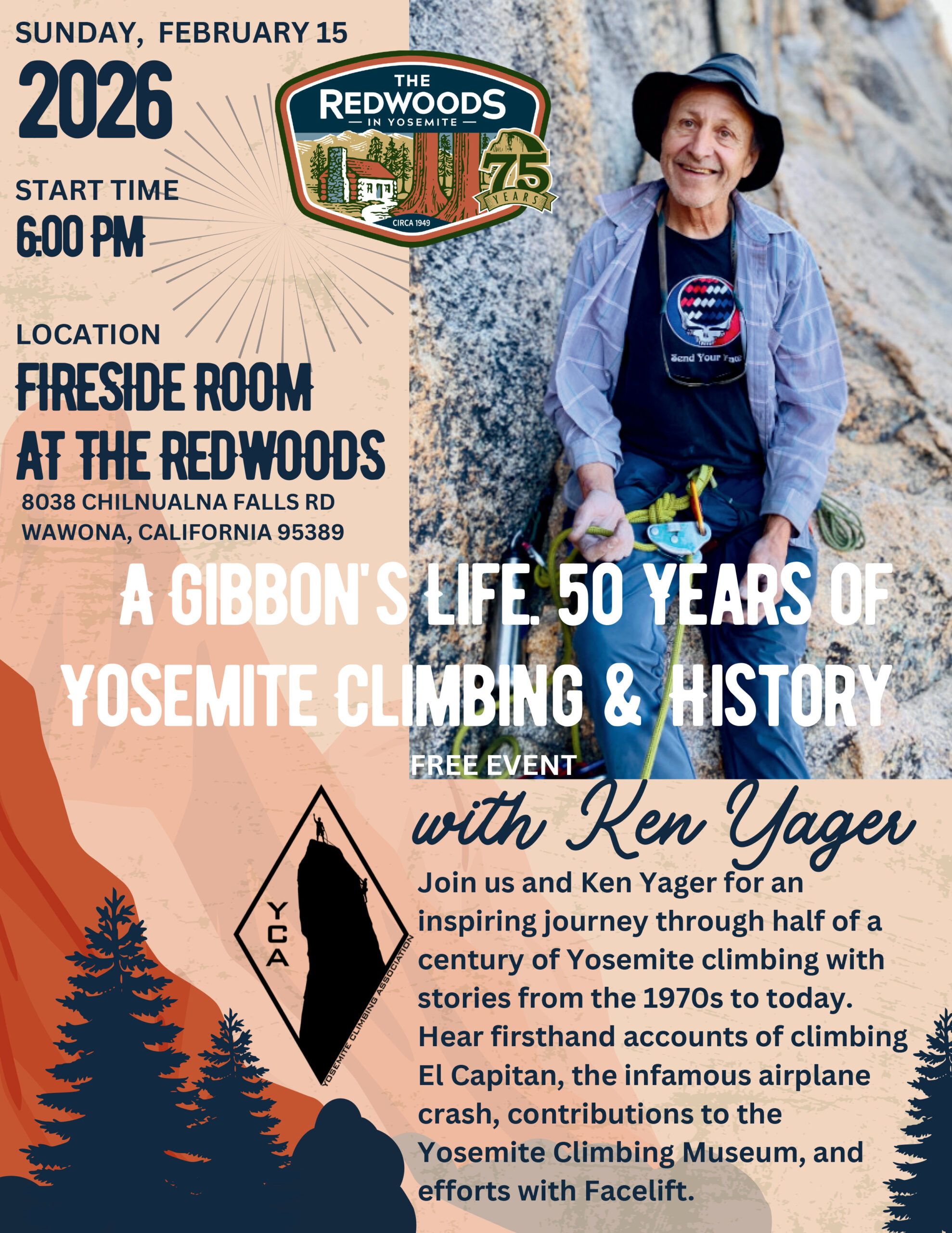 Join us in the Fireside Room at The Redwoods In Yosemite for an odyssey through Yosemite climbing stories from the 1970s until today with Ken Yager.