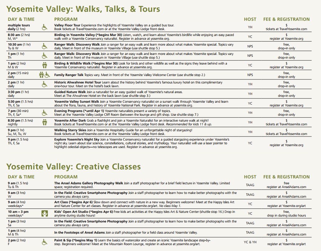 Programs led by NPS, the park partners, including Yosemite Hospitality, The Ansel Adams Gallery, and Yosemite Conservancy, are listed in the Yosemite Guide.